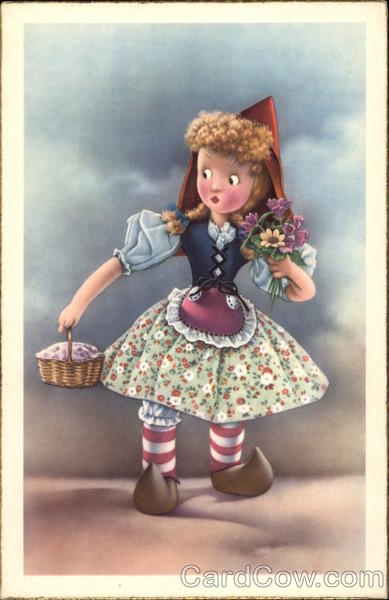 Little Dutch Girl Holding Basket and Bouquet of Flowers