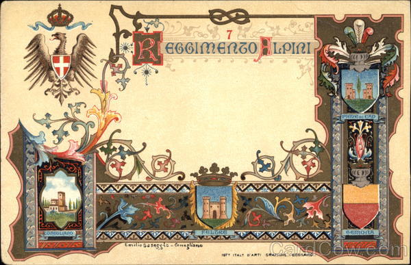 Front: COREGLIANO ee 76 EGGIMENTO ALPINI Emilio Baseggis-Conegliano n. FELTRE IST: ITAL? D'ARTI GRAFICHE BERGAMO PIEVE DI CAD GEMORA Back: 7° REGGIMENTO ALPIRI 300