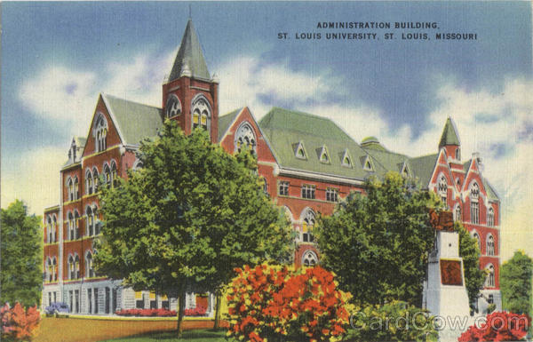Front: ADMINISTRATION BUILDING, ST. LOUIS UNIVERSITY, ST. LOUIS, MISSOURI Back: 15395. COLOUR PICTURE Sold by Gibson Merchandise Co., St. Louis, Missouri PUBLICATION, CANBRIDGE, MASS., U. S. A.