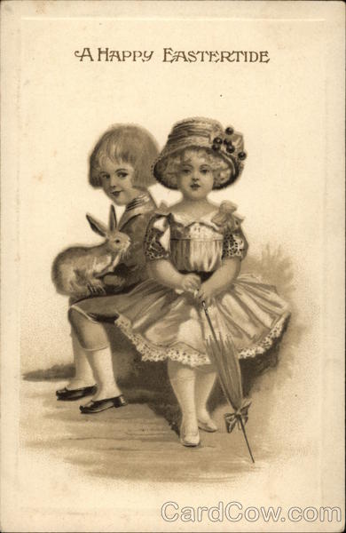 Front: A HAPPY EASTERTIDE Back: GOTTSCHALK, DREYFUSS & DAVIS, LONDON, MUNICH, NEW-YORK. PRODUCED IN GERMANY. SERIES No. 2676 10 ON THIS SIDE. TWO CENTS