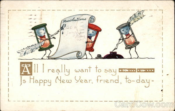 Front: Г- Resolutions Bi a заку nev HIP HORNYPR 13 say All I really want to Is Happy New Year, friend, to-day- ... Back: JAN 1 30 Whitney Made ET of S Sendrem Della Campbell Margeville Wash