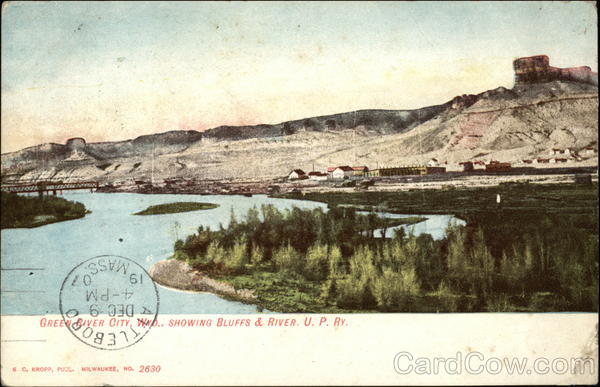 GREEN RIVER CITY, W., SHOWING BLUFFS & RIVER. U. P. RY.