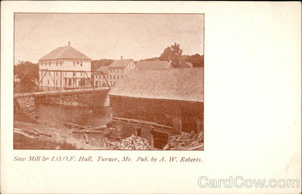 Front: |||||__ TI NK 11 HAND 11 Saw Mill & I.O.O.F. Hall, Turner, Me. Pub. by A. W. Roberts. Back: wa Bust 1-30-08 One Cent for United States; Two for Foreign. 25 Wis Bertha A Goff.