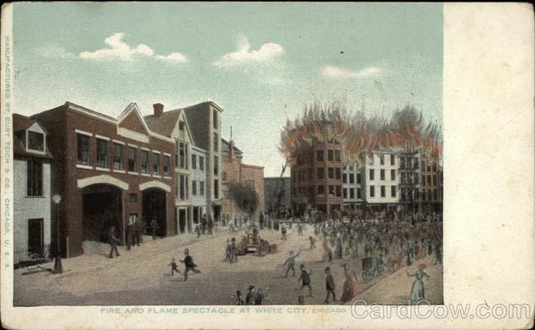 Front: MANUFACTURED BY CURT TEICH & Co., CHICAGO, U. S. A. 00 FIRE AND FLAME SPECTACLE AT WHITE CITY, CHICAGO 249 Back: Nothing but address on this side Two Cents