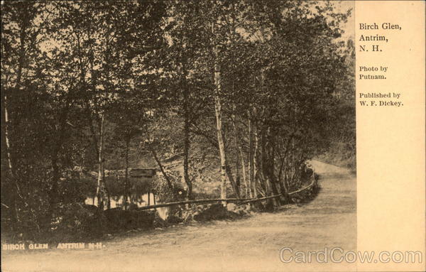 Front: BIROH GLEN ANTRIM NH Birch Glen, Antrim, N. H. Photo by Putnam. Published by W. F. Dickey. Back: Two Cents