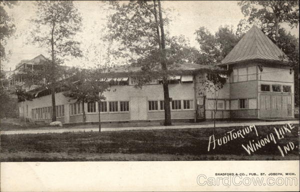 Front: III 12 III AUDITORIUM WINONG LIKE IND. BRADFORD & CO., PUB., ST. JOSEPH, MICH. Back: Spe Private Mailing Card ملعب Po AUTHORIZED BY ACT OF CONGRESS-MAY 19. 1898. TO (POSTAL CARD CARTE POSTALE.) PLACE THE HERE