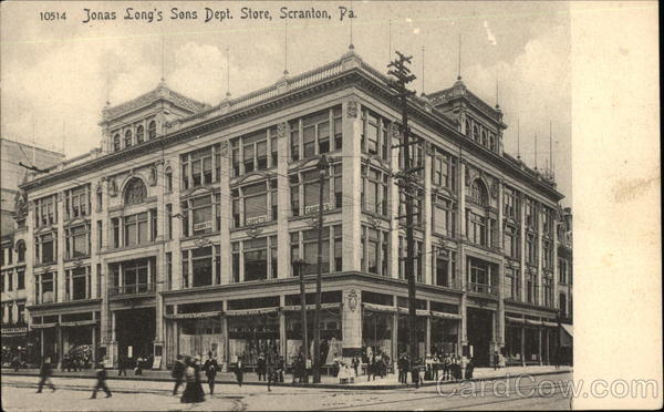 Front: DOWNGRATTER 10514 Jonas Long's Sons Dept. Store, Scranton, Pa. AAAA LONGS SONS CARPETS CARPETS ONAS LONGS SONS MILLINERY CARP S JONAS LOS SO PURNITURE Back: The Rotograph Co., N. Y., City. (Germany.) Two cents