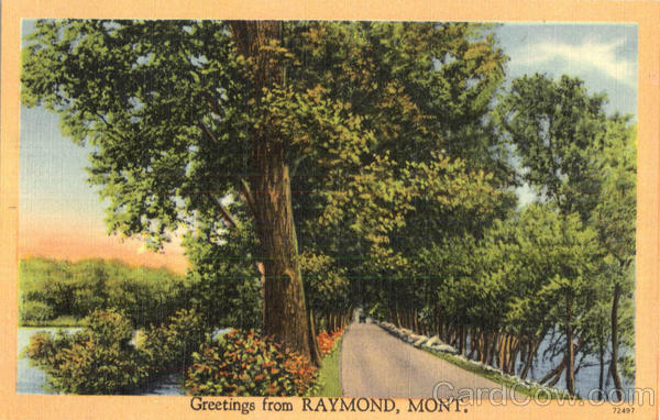 Front: Greetings from RAYMOND, MONT. 72497 Back: "TICHNOR QUALITY VIEWS" REG. U. S. PAT. OFF. MADE ONLY BY TICHNOR BROS., INC., BOSTON, MASS.