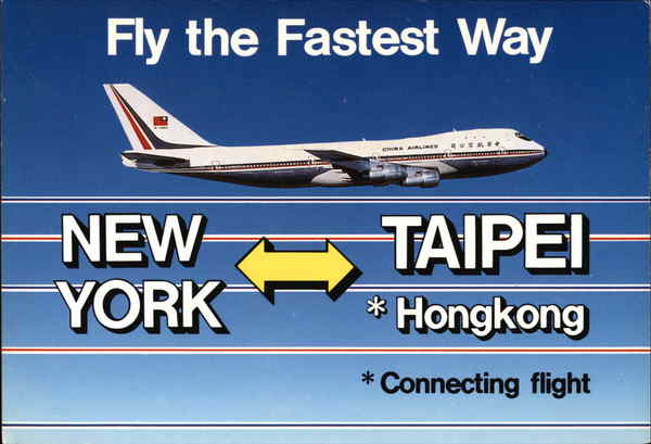 Front: Fly the Fastest Way .... 司公空航举中 CHINA AIRLINES YORK ΤΑΙΡΕΙ * Hongkong * Connecting flight Back: Fly the Fastest Way NEW YORK-TAIPEI AI 中華航空公司 CHINA AIRLINES
