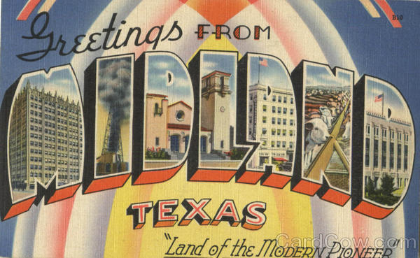 Front: Greetings B10 TEXAS Zand of the MODERN PIONEER Back: MADE IN U.S. A TICHNOR QUALITY VIEWS" REG. U.S. PAT, OFF. MADE ONLY BY TICHNOR BROS. INC., BOSTON. KASS 75238 PUB. BY JOHNSON NEWS AGENCY, BIG SPRING, TEXAS