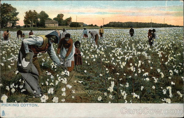 Front: PICKING COTTON. Back: 66 Raphael Tuck & Sons' Series No 1098, "Dixie Land. ART PUBLISHERS TO THEIR MAJESTIES THE KING AND QUEEN, By Appointment. CARTE POSTALE. POSTKARTE. ARTISTIC Photochromed in Saxony. XX