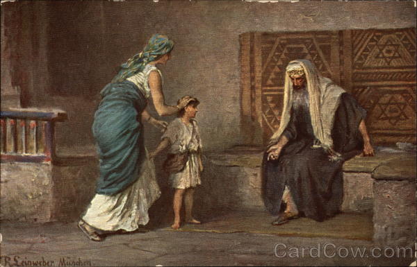 Front: R Leinweber München 2778 MIND IN SO Back: THE TIME OF THE JUDGES AND KINGS. 12 DESIGNS. HANNAH BRINGS SAMUEL TO ELI. 1. SAMUEL 1, 26. H. K. & Co. Munich. Copyrigt. HK