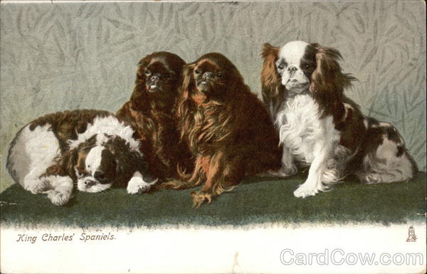 Front: King Charles Spaniels. NARE WARE Back: CHROMOGRAPHED IN SAXONY se po ART PUBLISHERS TO THEIR MAJESTIES THE KING AND QUEEN IST MARK FOR POSTAGE IN THE UNITED KINGDOM ONLY ARTISTIC TRADE MARK
