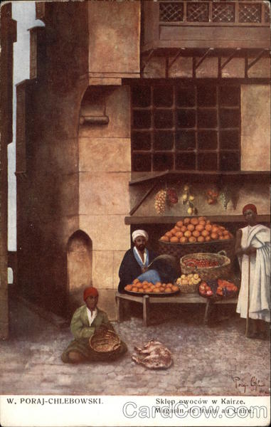 Front: W, PORAJ-CHLEBOWSKI. Sklep owoców w Kairze. Magasin de fruits au Caire. Back: Wyk. Zakłady Reprodukcyjne „AKROPOL" Kraków. (