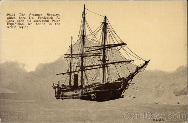 Front: 39321 The Steamer Bradley, which bore Dr. Frederick A. Cook upon his successful Polar Expedition, ice bound in the Arctic region. 8026 Back: PLACE. STAMP HERE