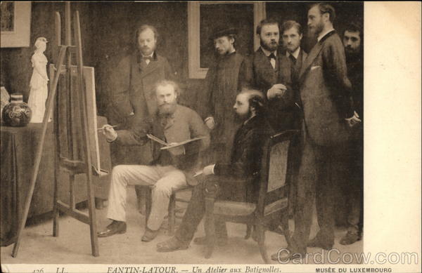 Front: 1103 126 LL. FANTIN-LATOUR. Un Atelier aux Batignolles. MUSÉE DU LUXEMBOURG Back: POST CARD CARTE POSTALE ОТКРЫТОЕ ПИСЬМО BRIEFKAART Maleratelier in Paris. A Studio Paris. TARJETA POSTAL