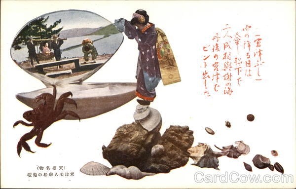 Asian Scenery - Water, Crab, Shells, & Geisha Girl