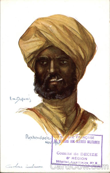Front: Em. Despines SETE Pafchendaele S ÊTE FRANÇAISE NOVALEURS AUK BLESSÉS MILITAIRES Evolérie indienne Comité de DECIZE 8º RÉGION Hôpital Auxiliaire No 8 Back: Visé Paris. No 11. Nos Alliés COLOR 152: Quai de Jemmapes CARTE POSTALE