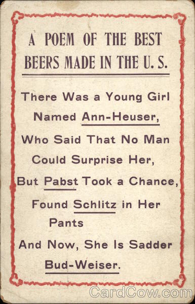 FREE A POEM OF THE BEST BEERS MADE IN THE U. S. There Was a Young Girl Named Ann-Heuser, Who Said That No Man Could Surprise Her, But Pabst Took a Chance, Found Schlitz in Her Pants And Now, She Is Sadder Bud-Weiser.