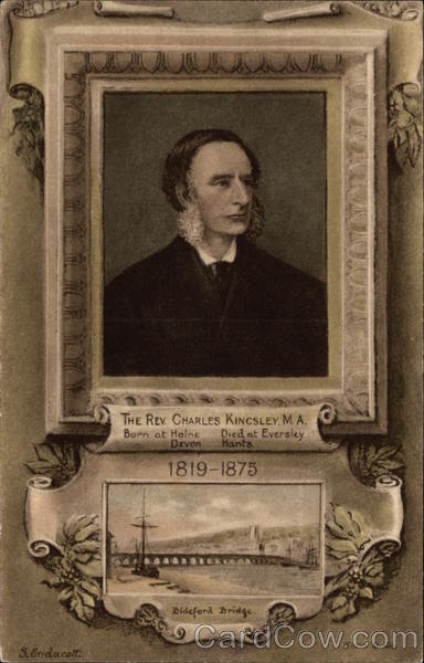 Front: 835 S.Endacott. 感人感兼职太太低功 THE REV. CHARLES KINGSLEY, M. A. Died at Eversley Hants. Born at Holne Devon 1819-1875 Bideford Bridge. Cast PAT Worth & Co. Back: WORTH'S SERIES KINGSLEY'S COUNTRY MOTORING CENTRE-DYMOND, BIDEFORD FOR ADDRESS