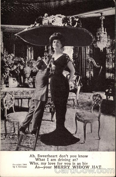 Front: Ah, Sweetheart don't you know What I am driving at? Copyright 1908 Why, my love for you is as big by I. Grollman As-your MERRY WIDOW HAT. aps Back: AND CANADA, FOREIGN, Two CENTS.