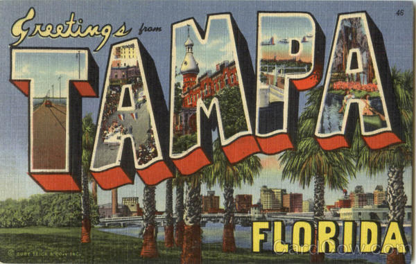 Front: Greetings 46 FLORIDA GURT TEIGH & CO IRc Back: T-Gandy Bridge A--Gasparilla M-University of Tampa P-Lafayette Street Bridge A-Dupree Gardens 5B-H1002 HILLSBORO NEWS CO., TAMPA, FLA.