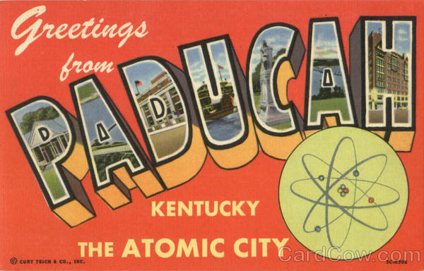 Front: Greetings PABUGAS Di D. KENTUCKY THE ATOMIC CITY ©CURT TEICH & CO., INC. 3C-H702 Back: DISTRIBUTED BY WILSON'S BOOK & STATIONERY STORE, PADUCAH, KY.