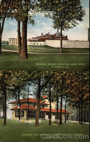 Front: FEDERAL PRISON SHOWING NEW WING, ATLANTA, GA. GUARDS AND WARDENS HOME, FEDERAL PRISON, ATLANTA, GA. Back: MADE IN U. S. A PUBLISHED BY I. F. CO. INC., ATLANTA, GA. PHOTOCHROM. A-25337 THIS SPACE FOR ADDRESS ONLY.