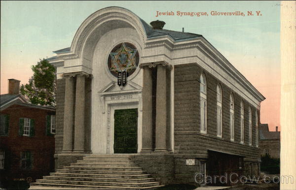 Front: 200 896. (3) nou VO IX IV כנסת ישראל Jewish Synagogue, Gloversville, N. Y. Back: :00 Sunusuan SUOS & Annars in ko pa New York and Boston. FAMOUS V&SONS CARD. THROUGHOUT THE WORLD. Address Only