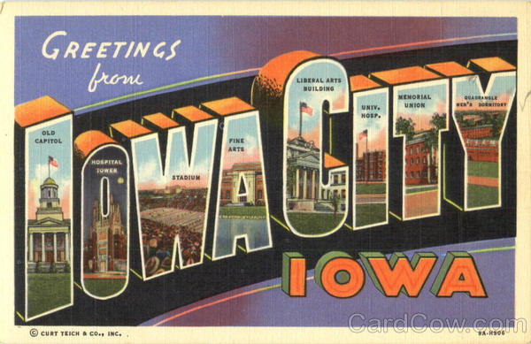 Front: GREETINGS LIBERAL ARTS BUILDING MEMORIAL QUADRANGLE MEN'S DORMITORY UNION "AINA HOSP. OLD CAPITOL FINE ARTS HOSPITAL TOWER STADIUM IOWA CURT TEICH & CO., INC. 9A-H506 Back: DISTRIBUTED BY VOSS NEWS COMPANY. IOWA CITY, 10WA