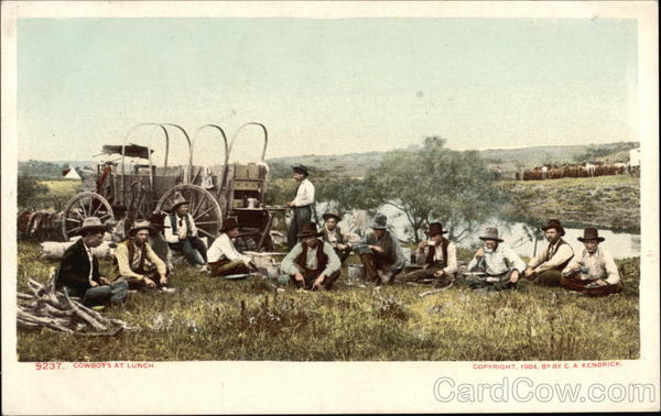 Front: 9237. COWBOYS AT LUNCH. COPYRIGHT, 1904, BY BY C. A. KENDRICK. Back: and Canada. Foreign, Two Cents.