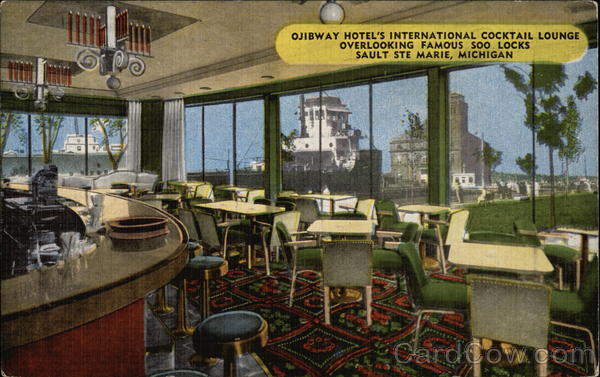 | Overlooking famous Soo Locks. The new cocktail lounge at Hotel Ojibway provides front-row-center seats for patrons to watch the ships pass only 150 feet away from the large picture windows. Guests of the lounge can watch the Great Lakes' vessels actually going through the Soo Locks |