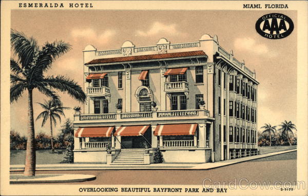 | The Esmeralda Hotel is located on Biscayne Boulevard at 5th Street. This is a hotel of quiet dignity, refinement and pleasant surroundings - Near enough to the business section for convenience, yet far enough away to avoid the downtown noise - Open year around - Moderate rates |