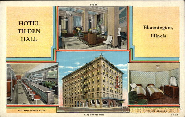 Front: LOBBY НOTEL Bloomington, TILDEN Illinois HALL 11111 PULLMAN COFFEE SHOP TYPICAL BEDROOM FIRE PROTECTION 3A424 Back: TILDEN HALL Bloomington, Ill. New: Modern MADE BY CURT TEICH & COMPANY, INC., CHICAGO, U.S.A.