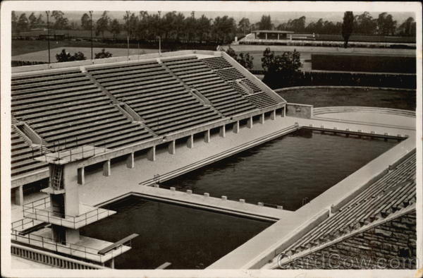 Front: Tatatata HA Back: 4. Reichssportfeld. Blick von der Deutschen Kampfbahn auf das Schwimmstadion Amtliche Olympia-Postkarte Reichssportverlag, Berlin SW 68 Echte Fotografie Verkaufspreis 15 Pf.