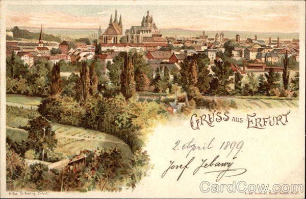 Front: Verlag: Ch. Niedling, Erfurt. LOS ****** 111 aus GRUSS AUS FRFURT 2. otpril 1899. Jouf Jetayy lan Friedr. Kirchner, Kunst-Anstalt, Erfurt. Back: An in Wohnung (Straße und Hausnummer) Postkarte