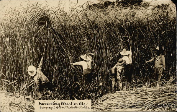 Front: Harvesting Wheat in mo. Copyright 1909 by Martin Post Card Co. Back: PUBLISHED BY THE NORTH AMERICAN POST CARD CO. KANSAS CITY, U. S. A. UNITED STATES OF AMERICA INDUSTRY-AGRICULTURE FOR DEFENSE ADDRESS