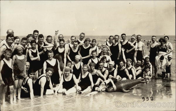 Large Group of Men, Women & Children in Swimwear on the Beach