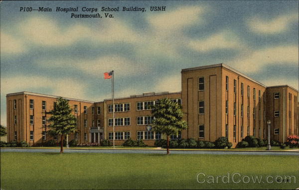Front: P100-Main Hospital Corps School Building, USNH Portsmouth, Va. 10 3C-H281 Back: DISTRIBUTED BY MADISON'S, INC., WILLIAMSBURG, VA. GENUINE CURTEICH-CHICAGO "C.T. ART-COLORTONE" POST CARD (REG.U.S. PAT. OFF.) PLACE