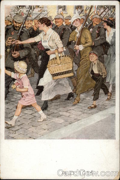 Front: B.W A.D. 1915 Back: Feriegspoſtkarten von B. Wennerberg Nr. 7. Ausmarſch QR. OTTO SCHORS WEISSUNFELS & S 485 An in. Verlag von Albert Langen, München Druck von Heſſe & Becker, Leipzig 27. 5. 72