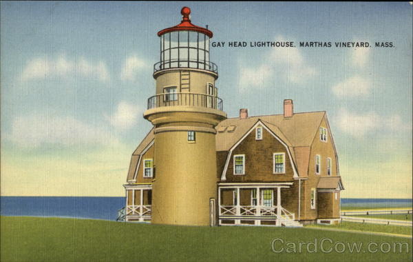 Front: GAY HEAD LIGHTHOUSE. MARTHAS VINEYARD. MASS. Back: MADE IN U. S. A TICHNOR QUALITY VIEWS REG. U.S. PAT. OFF. MADE ONLY BY TICHNOR BROS. INC., BOSTON, MASS. 62945