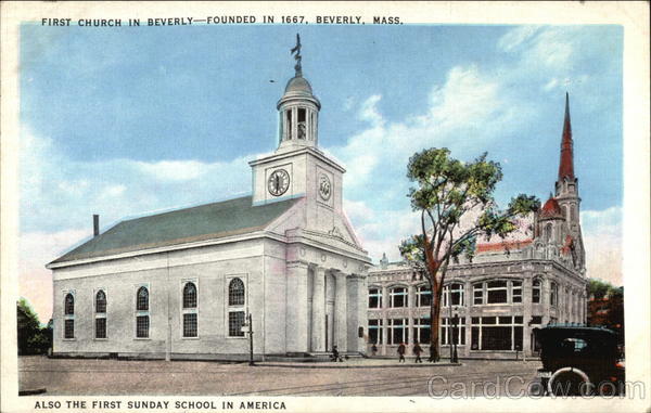 Front: FIRST CHURCH IN BEVERLY-FOUNDED IN 1667, BEVERLY, MASS. ALSO THE FIRST SUNDAY SCHOOL IN AMERICA Back: 128599 ng ) ۱۱۱۱۱۱۱ DOST DOZIO 04-