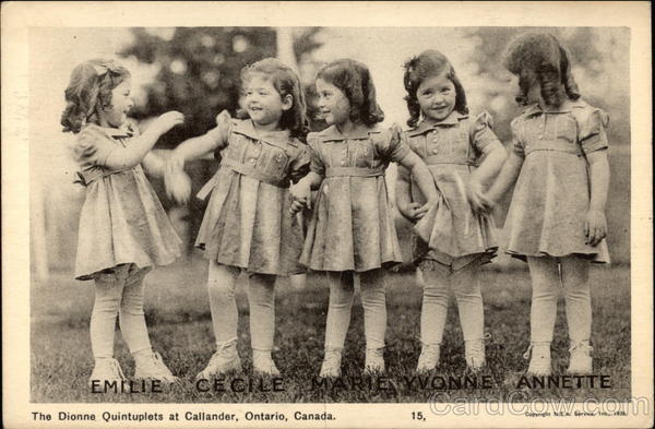 Front: EMİLIE CECILE TENYVONNE ANNETTE The Dionne Quintuplets at Callander, Ontario, Canada. 15, Copyright N.E.A. Service, Inc., 1938. Back: MADE IN CANADA Given by Mrs C.W. gelerin 1940 CO OTTAWA