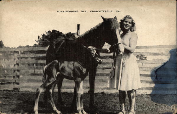 Front: VA. PONY-PENNING DAY, CHINCOTEAGUE, Back: со 32858 PUB. BY H & N PHARMACY, VACATION SOUVENIRS, POST CARDS MADE IN U. S. A. BY E. C. KROPP CO., MILWAUKEE, WIS. (JAA) Good hotels--good fishing A good place to visit