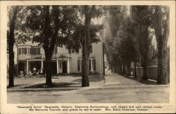 Front: "Newcastle Arms" Newcastle, Ontario. Charming Surroundings, well chosen and well cooked meals. We Welcome Tourists, also guests by day or week. Mrs. Stella Anderson, Hostess. Back: mg Published by F. H. Leslie. Limited, Niagara Falls, Ont