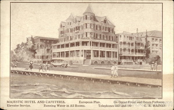 Front: MA T E MAJESTIC HOTEL AND CAFETERIA. Elevator Service. COOOO MAJESTIC European Plan. Running Water in All Rooms. On Ocean Front and Ocean Pathway. G. R. HAINES Telephones 3321 and 190 Back: THIS SPACE FOR ADDRESS ONLY
