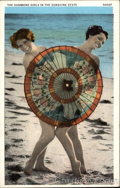 Front: THE SUNSHINE GIRLS IN THE SUNSHINE STATE FO 20 GO 502GF Back: PUB. BY THE HARTMAN CARD CO., PORTLAND, ME., & TAMPA, FLA. From the Mountain Pines of Maine to t 128977 e Sunny Sands of Florida HERE