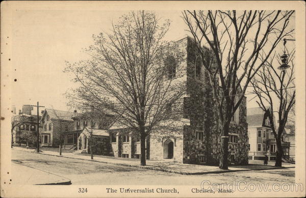 Front: 324 MAMNAZAB The Universalist Church, Chelsea, Mass. Back: Pub. by THE NEW ENGLAND NEWS CO., Boston, Mass. Post Card 75