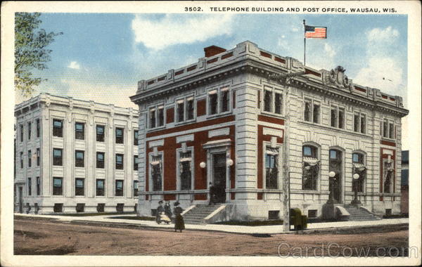 Front: }} 3502. TELEPHONE BUILDING AND POST OFFICE, WAUSAU, WIS. Back: E. A. BISHOP, PUBLISHER, RACINE, WIS. R-26058 and Island Possessions: Cuba, Canada and For Foreign. UK