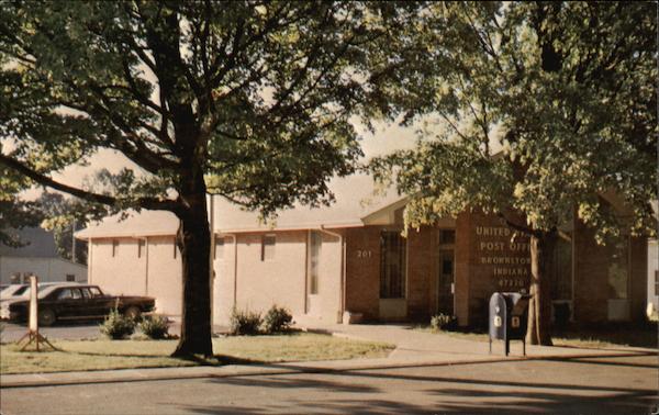 Front: POST OFFIN 201 BROWNSTON INDIANA 47220 Back: U.S. POST OFFICE Brownstown, Indiana 47220 Located at Cross & Sugar Streets Comingore Cards, Honso, Texas 78861 Photo by Comingore 721249